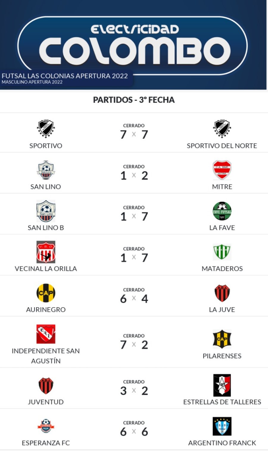 Se desarrolló la 3er fecha de la Copa Electricidad Colombo la cual dejó los siguientes resultados: