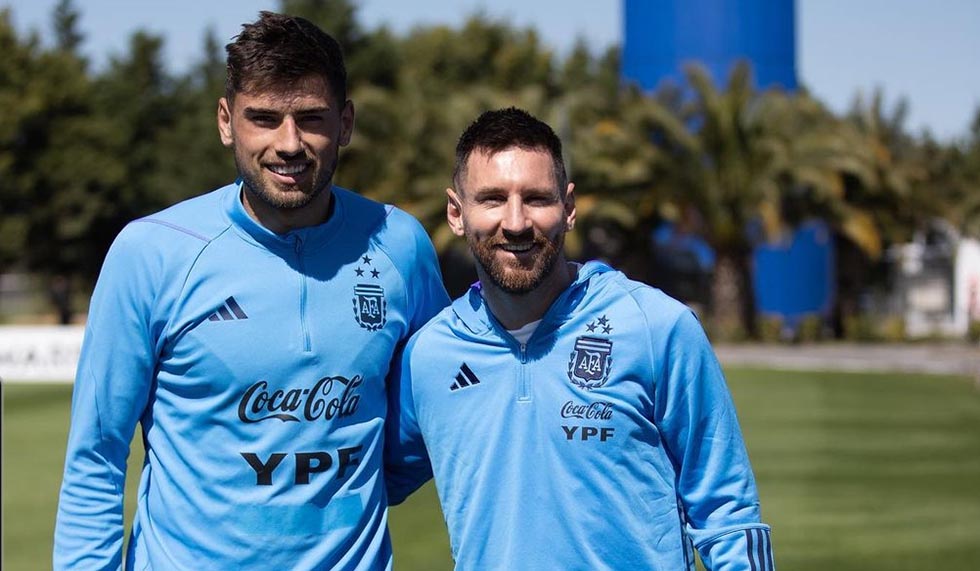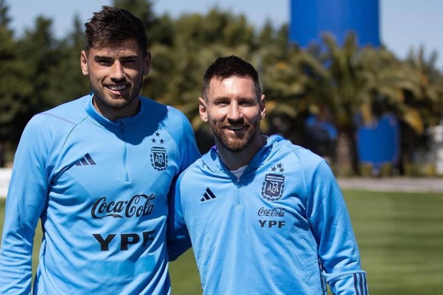 Una de las sorpresas en el predio de la AFA fue la presencia de Lionel Messi, Ángel Di María, Leandro Paredes y Cristian Romero al borde de la cancha para seguir de cerca los amistosos de la sub 23.