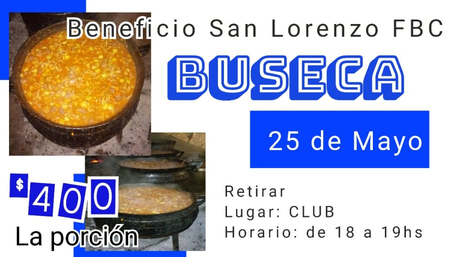 San Lorenzo Foot Ball Club comunica a socios, simpatizantes y a la comunidad en general que hará un benefico de buseca el 25 de mayo de 2021, a $400 la porción. Con el fin de recaudar fondos para la mano de obra del mejoramiento del frente del salón principal.-