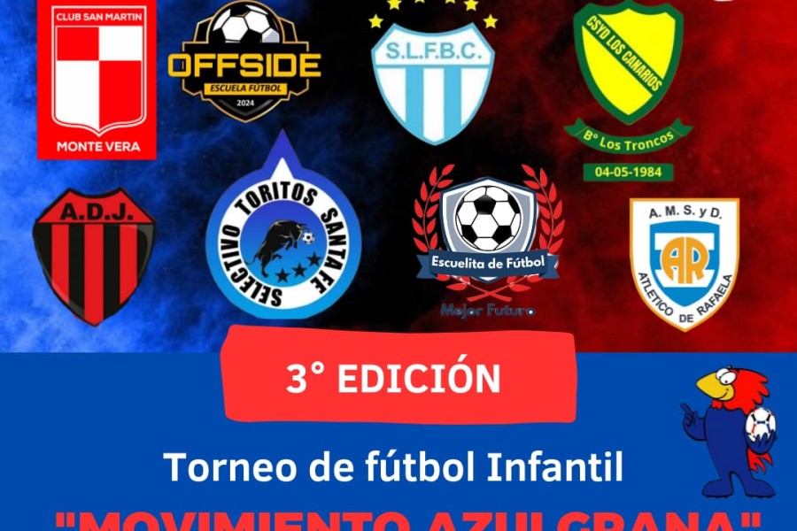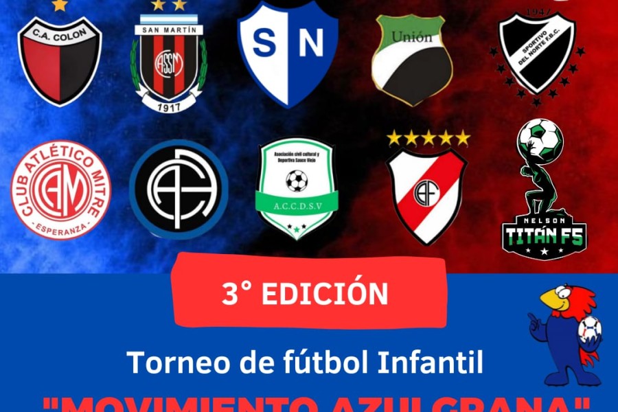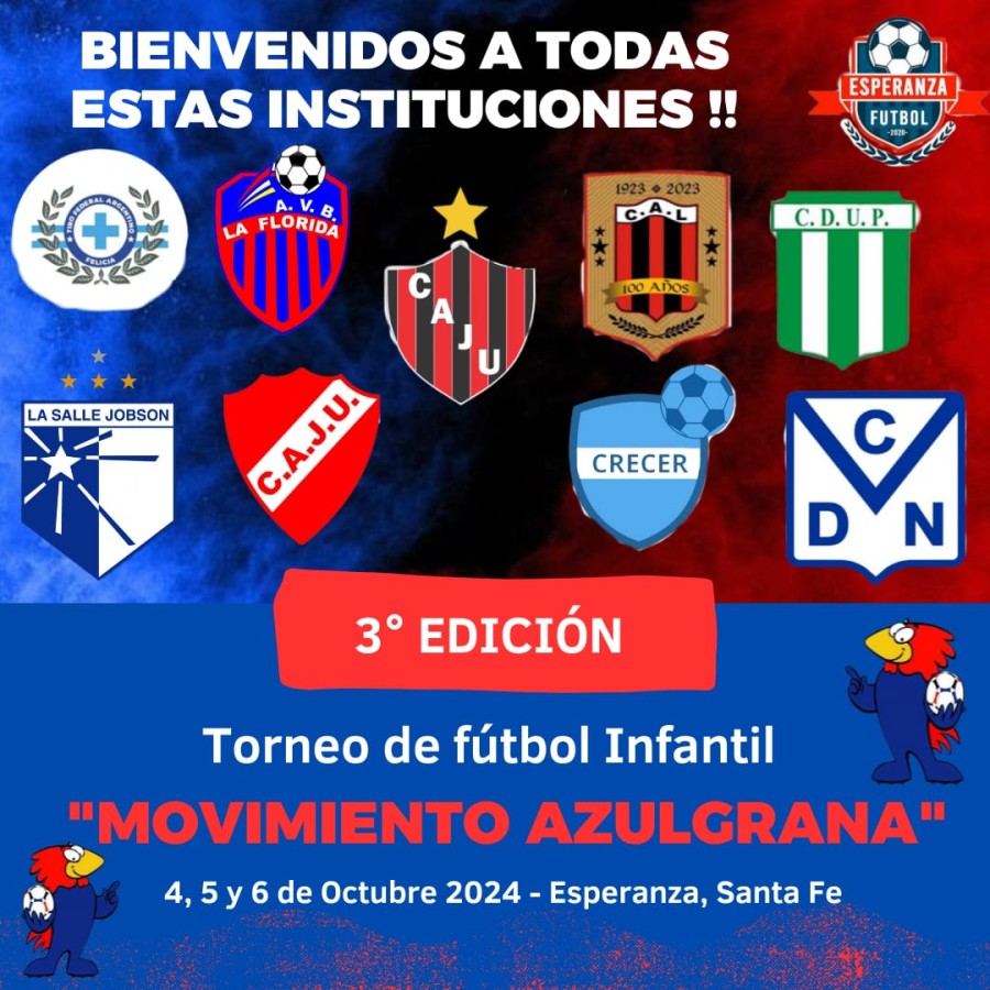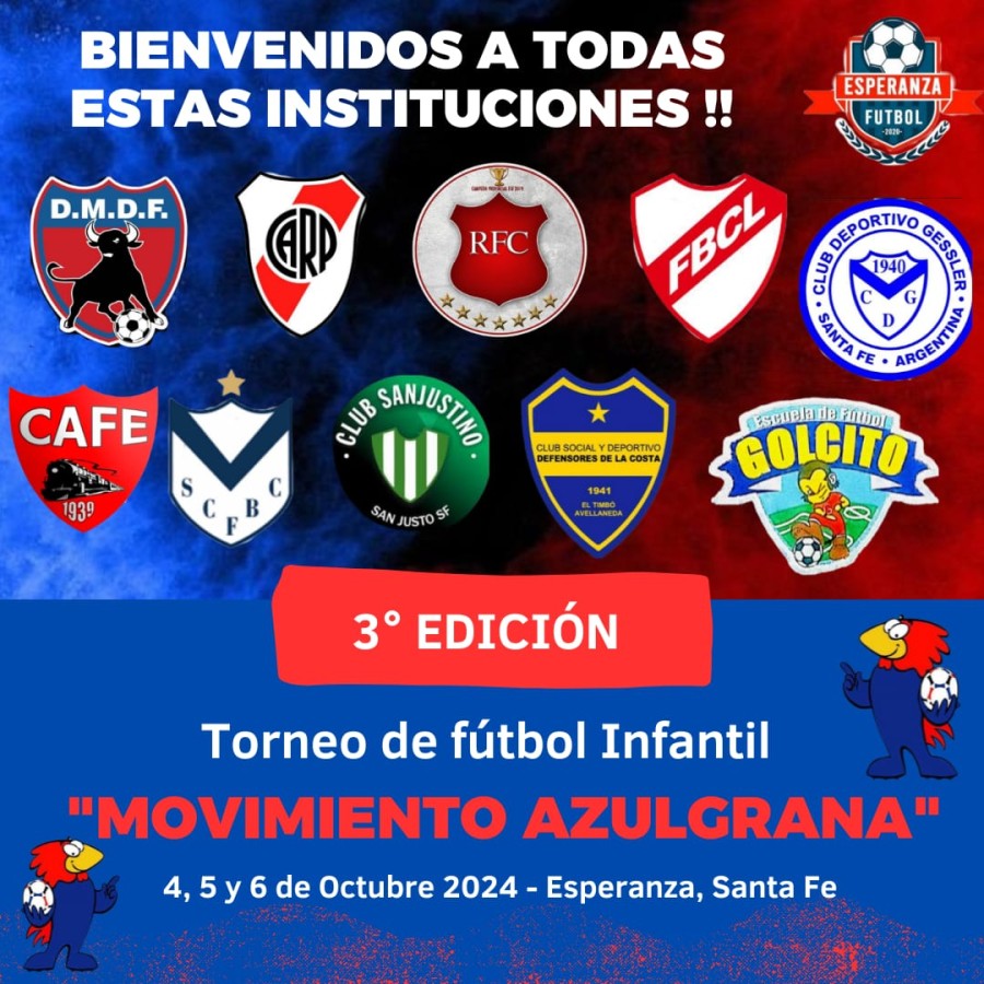 Esperanza Fútbol organiza para este 4, 5 y 6 de octubre se viene la tercera edición del torneo de fútbol infantil "Movimiento Azulgrana". En la misma participarán equipos de la provincias de Córdoba, Santiago del Estero y Entre Ríos, como así también de las localidades de Santa Fe, Avellaneda, Romang, Rafaela, Gálvez y por supuesto del departamento Las Colonias.