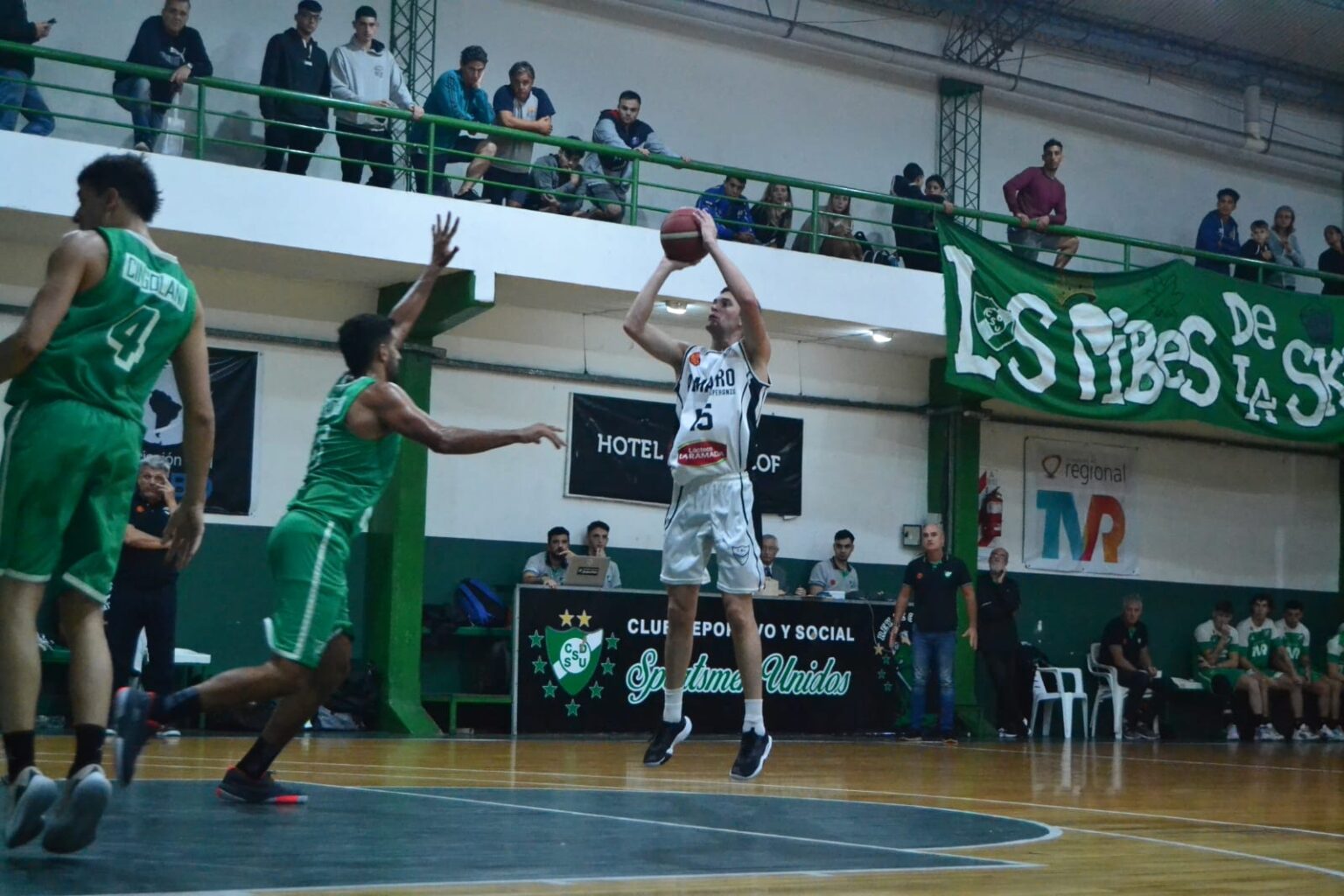 En el arranque del partido, Sportsmen fue el primero en hacer pie con un lindo juego colectivo conducido por Foradori y con un gran Boixader (5) haciendo de las suyas en la zona pintada. Por el otro lado, también el más lucido fue un pívot, Pfeiffer (6), quien estuvo muy fino con el tiro de media distancia. Acompañado del gran talento individual de Strack (5), quien pudo sumar gracias a su poderío en el uno contra uno. Muy importante el ingreso de Traglia (7), que terminó siendo clave en el final del cuarto para un “Verde” que terminó presionando las salidas rivales. Luego, apareció un demoledor Riquelme (5) para la visita y terminaron un cuarto cambiante, empatados en 20.