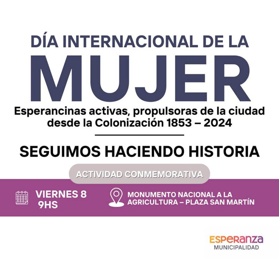 La Municipalidad de Esperanza llevará adelante este viernes 8 de marzo un acto en conmemoración al Día Internacional de la Mujer. El mismo se realizará en el Monumento Nacional a la Agricultura de plaza San Martín a partir de las 9 horas.