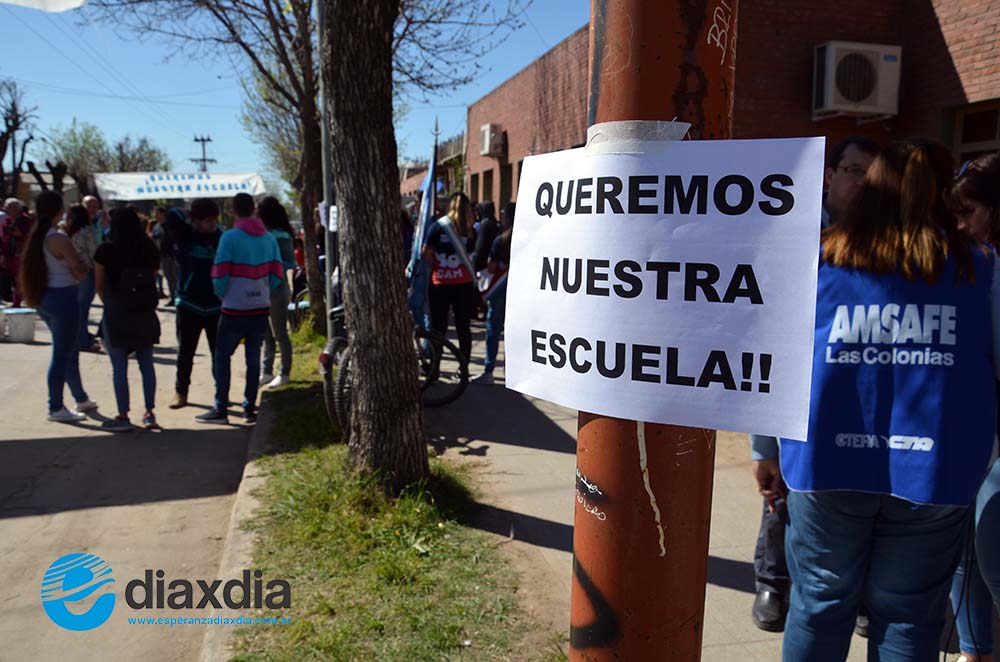 Docentes, directivos, vecinos, concejales, representantes gremiales y directivos de otras escuelas se movilizaron frente al edificio escolar para reclamar a las autoridades provinciales y nacionales la finalización de las obras del nuevo edificio.