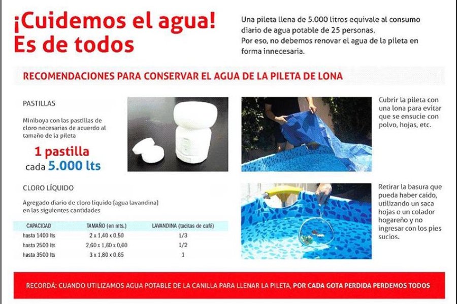 Una pileta de lona llena de 5.000 litros equivale al consumo diario de agua potable de 25 personas. Con la dosificación diaria de hipoclorito de sodio (lavandina) o con una pastilla de cloro sólido podemos conservarla en adecuado estado por varios días (ver infografía adjunta).
