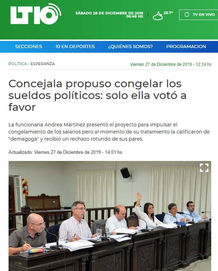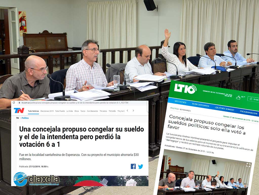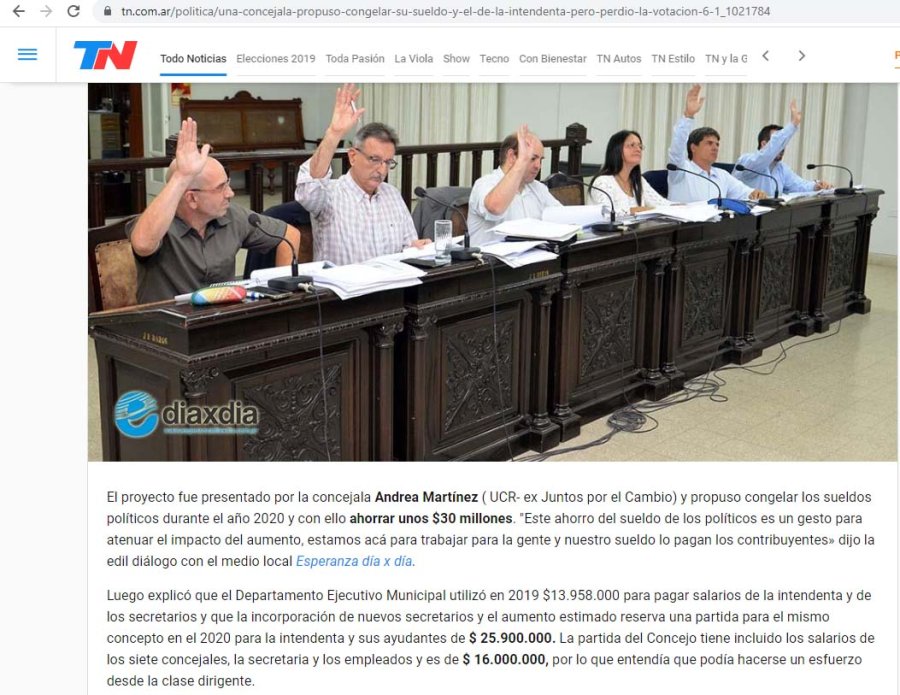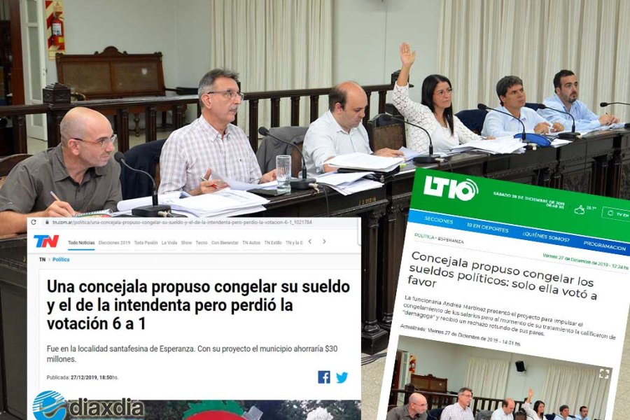 "Una concejala propuso congelar su sueldo y el de la intendenta pero perdió la votación 6 a 1" contó el canal "Todo Noticias" este viernes. "Concejala propuso congelar sueldos políticos: solo ella votó a favor" cuentan desde LT10 Universidad.