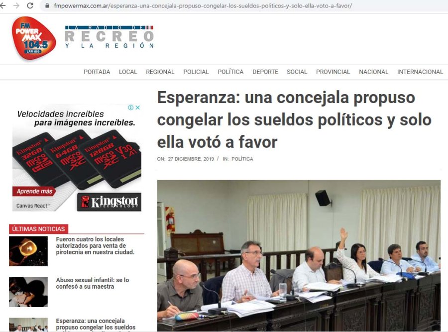 Aquí la nota reflejando la oposición de seis concejales a congelarse los salarios en la ciudad de Esperanza, reflejada en la visitada web del Canal Todo Noticias:
