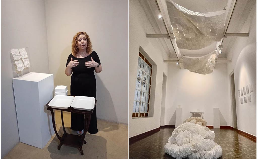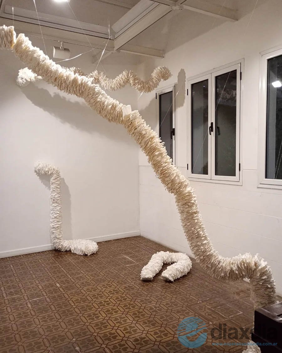 En un momento de la velada la artista oriunda de Buenos Aires, mostró el método de trabajo a los presentes los que tomaron magnitud del trabajo realizado con la instalación presentada.