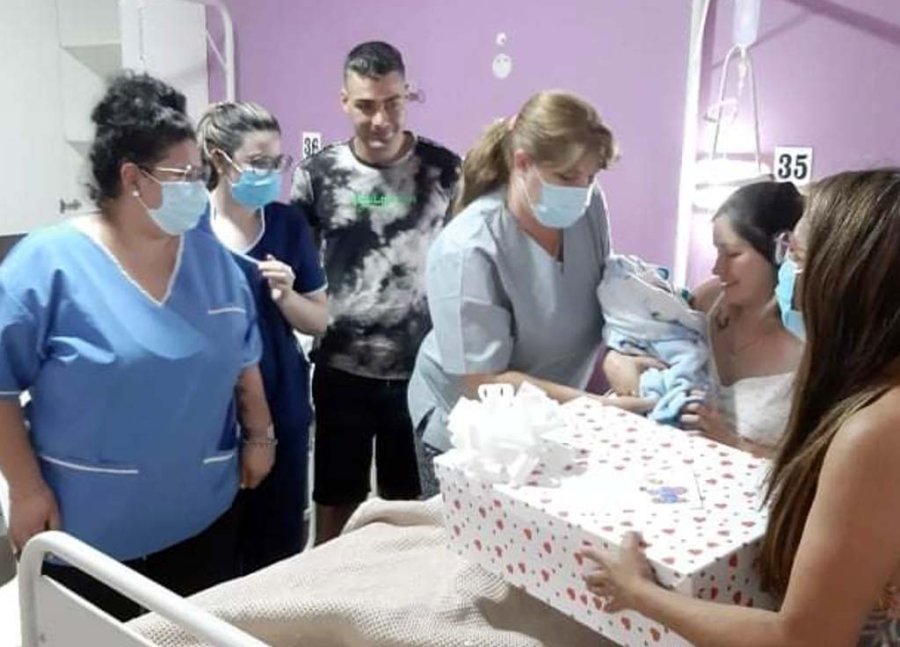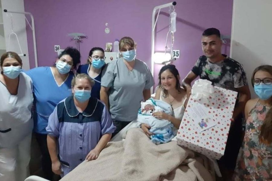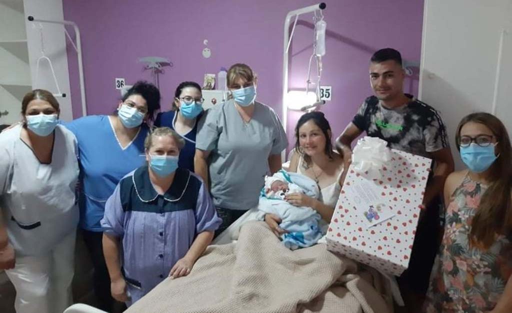 Como lo muestran las imágenes recibió de regalo el ajuar que cada año entrega la Cooperadora del SAMCo al primer bebe nacido en ese centro asistencial.