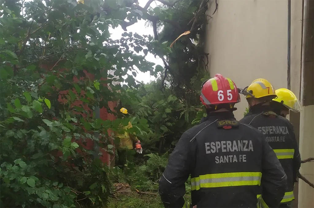 Por motivos de la tormenta se produce la caída de un árbol de gran porte sobre una vivienda, bomberos voluntarios de Esperanza trabajo para extraer y eliminar el riesgo de posible daños.