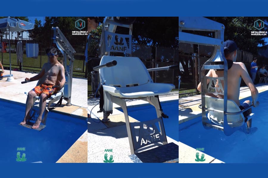 Se trata de la silla elevadora de piscina que está instalada y ya funciona en la pileta adaptada del Centro de Día Ubajay de la institución.