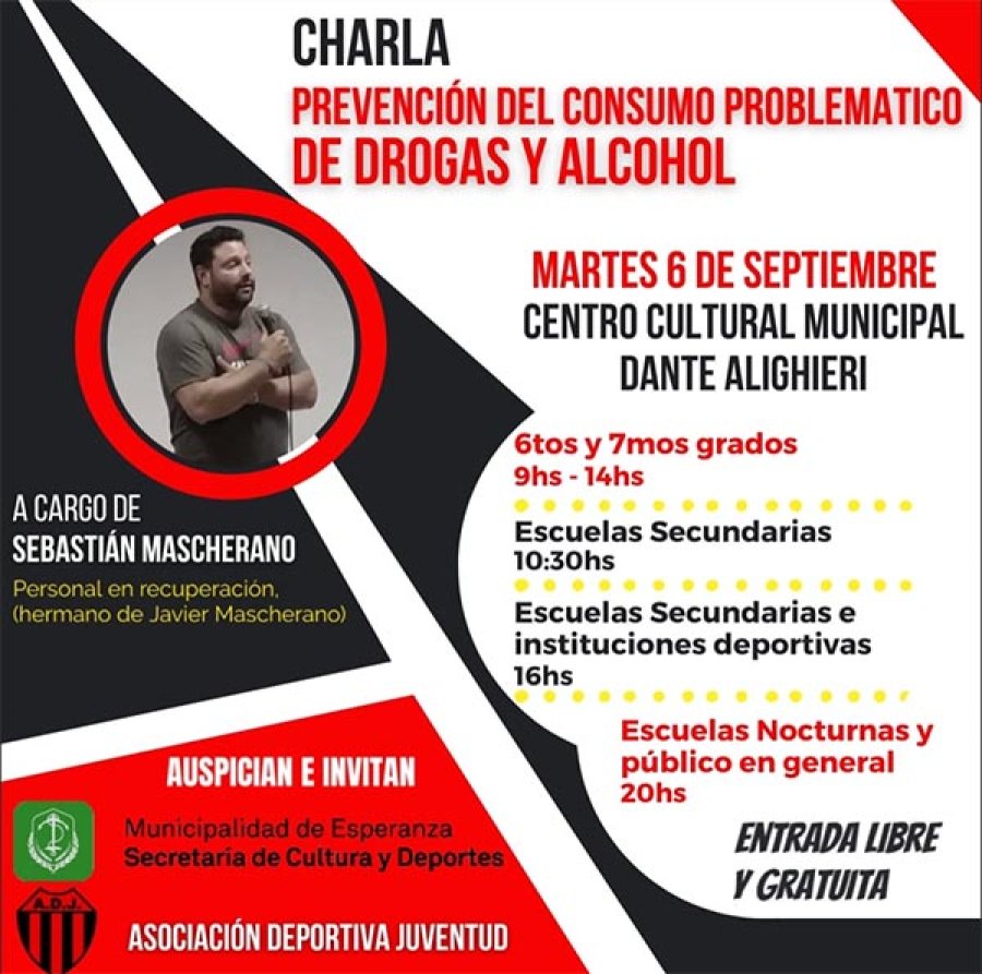 El hermano del futbolista Javier Mascherano, visitará la ciudad este martes 6 de setiembre para brindar una charla sobre “Prevención en el consumo problemático de drogas y alcohol”.
