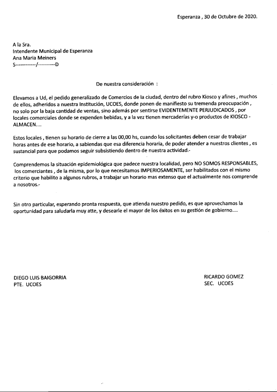 Aquí la nota de la Unión de Comerciantes Esperancinos sobre el reclamo a la intendenta municipal para considerar la situación planteada por comerciantes que rubros similares con diferentes horarios:
