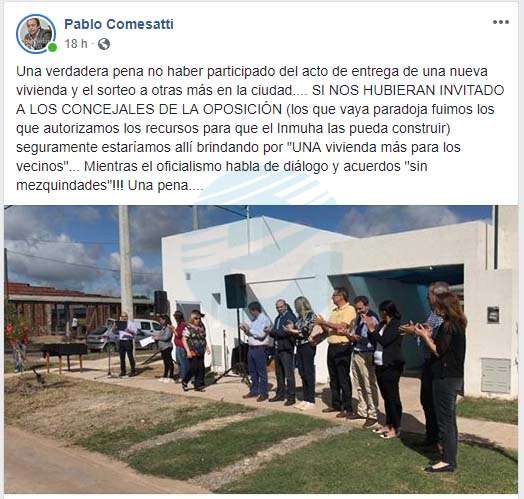 "Una verdadera pena no haber participado del acto de entrega de una nueva vivienda y el sorteo a otras más en la ciudad.... SI NOS HUBIERAN INVITADO A LOS CONCEJALES DE LA OPOSICIÓN (los que vaya paradoja fuimos los que autorizamos los recursos para que el Inmuha las pueda construir) seguramente estaríamos allí brindando por "UNA vivienda más para los vecinos"... Mientras el oficialismo habla de diálogo y acuerdos "sin mezquindades"!!! Una pena...."