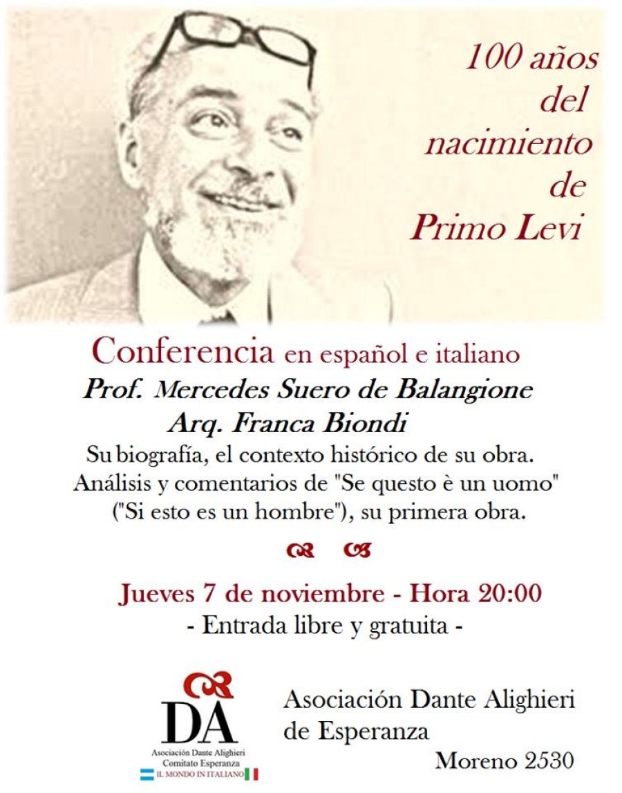 Desde la Asociación Dante Alighieri de Esperanza conmemorarán el centenario del nacimiento del escritor italiano Primo Levi, de origen judío sefardí, autor de memorias, relatos, poemas y novelas.