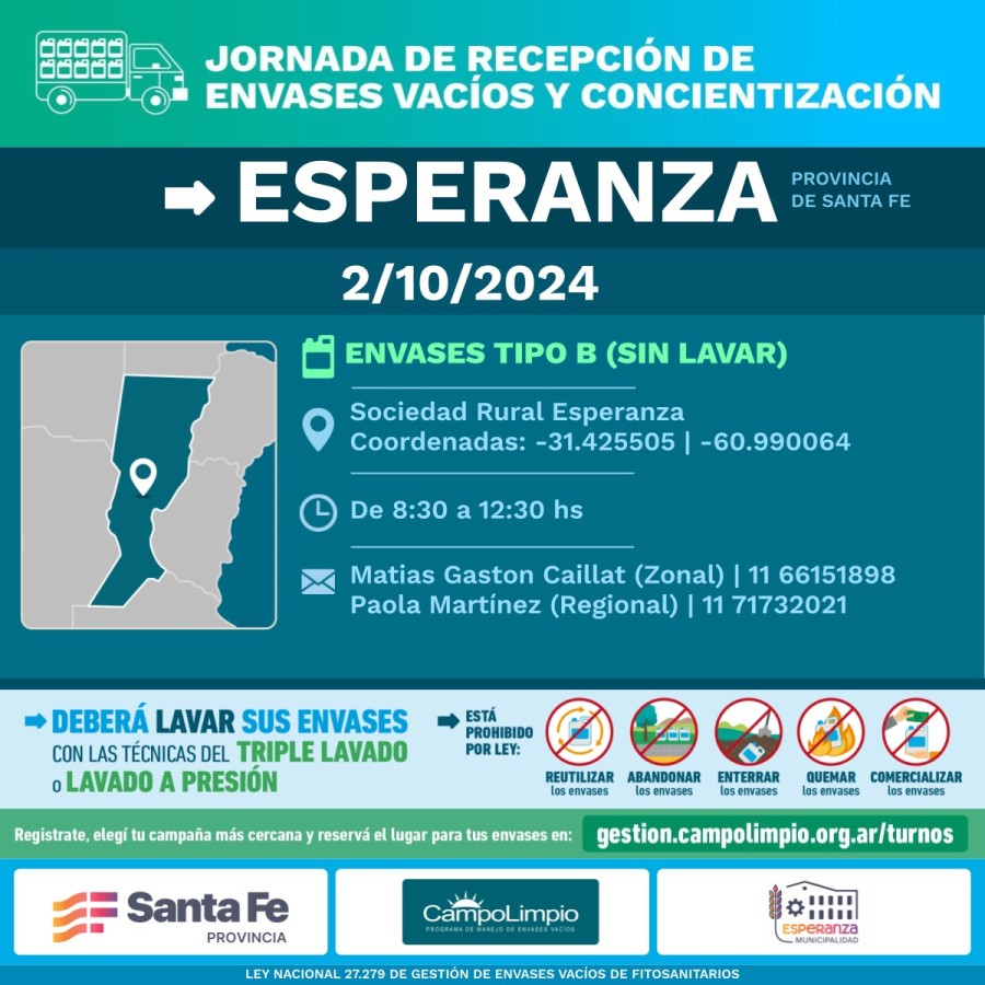 Apuntó que “los bidones se recepcionarán el miércoles 2 de octubre de 8 a 12, bajo un protocolo de bioseguridad, y pueden acercarse productores de Esperanza y de toda la región” y explicó que “las personas que van a manipular el material cuentan con los elementos de protección personal y por eso, esos envases se llevan para una degradación final, a una empresa del sur de la provincia. Para el caso de los bidones clase A que tienen un lavado, se pueden reutilizar y para eso entregan a una empresa cerca de Rosario donde lo que hacen es reutilizarlos para reductores de seguridad, cañerías subterráneas, fratachos, mangos, baldes de albañil y postes de alambrado donde el componente de los bidones sea una capa interior, no deben estar en contacto con las personas, animales y el ambiente”.