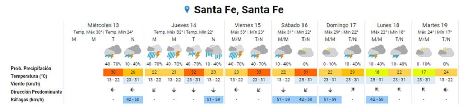 El pronóstico del tiempo para lo que resta del miércoles advierte tormentas aisladas con ráfagas de viento del Este por la noche. Desde esta noche hasta la mitad del jueves está vigente una alerta amarilla por tormentas para todo el departamento Las Colonias.