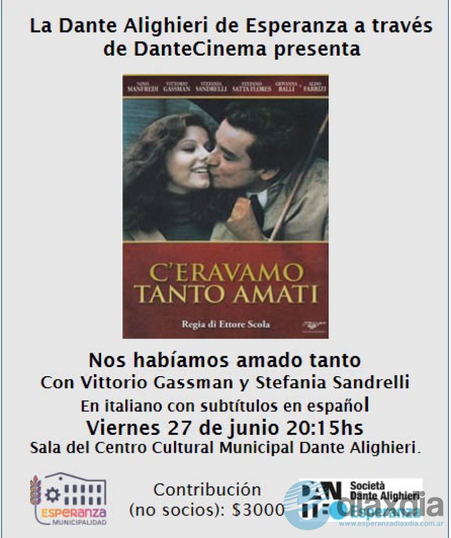 La Asociación Dante Alighieri de Esperanza invita a participar de la proyección del film italiano “C’eravamo tanto amati” (Nos habíamos amado tanto) que se realizará el viernes 27 de junio a las 20:15 hs. en el Centro Cultural “Dante Alighieri”.