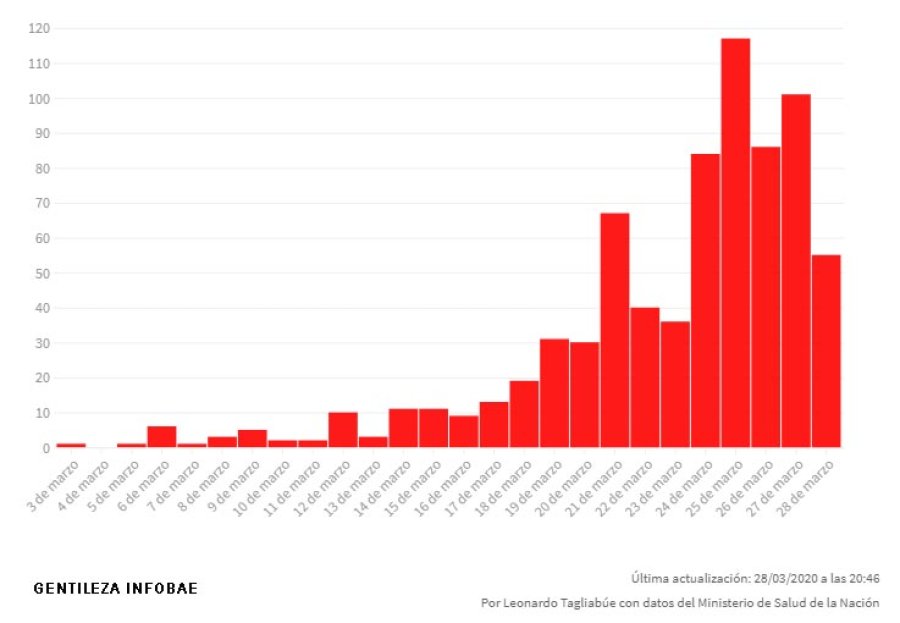 El reporte N° 28 señaló que 18 son de la Ciudad Autónoma de Buenos Aires, 13 de Santa Fe, 8 de la provincia de Buenos Aires, 5 de Chaco, 4 de Tierra del Fuego, 4 de Corrientes, 2 de Neuquén, 1 de Córdoba y 1 de Mendoza. Si bien la suma es de 56, el Ministerio de Salud aclaró que el de Córdoba es un caso reclasificado, el cual el 26 de marzo le fue atribuido a San Luis.
