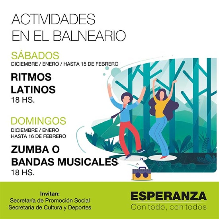 18: “Programa de Verano” en el Balneario Camping Municipal Intendente Bertero, con la presentación de la Banda Musical “La Autentika”. Organiza e invita Municipalidad de Esperanza.