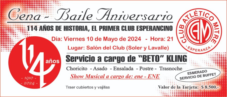 Este viernes 10 de mayo es el cumpleaños del Club Mitre, 114 años de vida, es el primer club de nuestra ciudad. Por lo cual la comisión se encuentra abocada a la realización de la gran cena aniversario.
