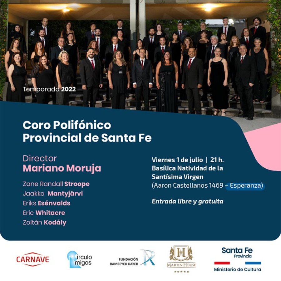 La Fundación Ramseyer Dayer tiene el agrado de invitar a la comunidad a un concierto especial del Coro Polifónico Provincial de Santa Fe, el mismo se presentará bajo la dirección del Maestro Mariano Moruja el próximo viernes 1 de julio a las 21 hs interpretando obras de los compositores Zane Randall Stroope, Jaakko Mäntyjärvi, Ēriks Ešenvalds, Eric Whitacre y Zoltán Kodály.