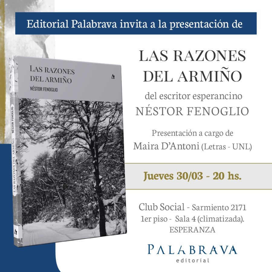 El periodista, editor y escritor esperancino Néstor Fenoglio presentará su nuevo libro “Las razones del armiño”. Será este jueves 30 de marzo a las 20 horas en el Club Social, primer piso, sala 4 climatizada.