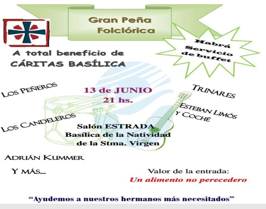 Por otra parte, anunció que se está organizando la 1° Peña Folclórica a beneficio de Cáritas. Será el jueves 13 de junio, desde las 21 horas, en el Salón Estrada con ingreso por Aarón Castellanos.