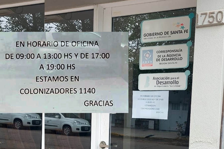 "En horario de oficina de 9 a 13 y de 17 a 19 hs. estamos en Colonizadores 1140" explica el cartel que estaba ayer prolijamente impreso en la puerta de la delegación local del ministerio de la producción.