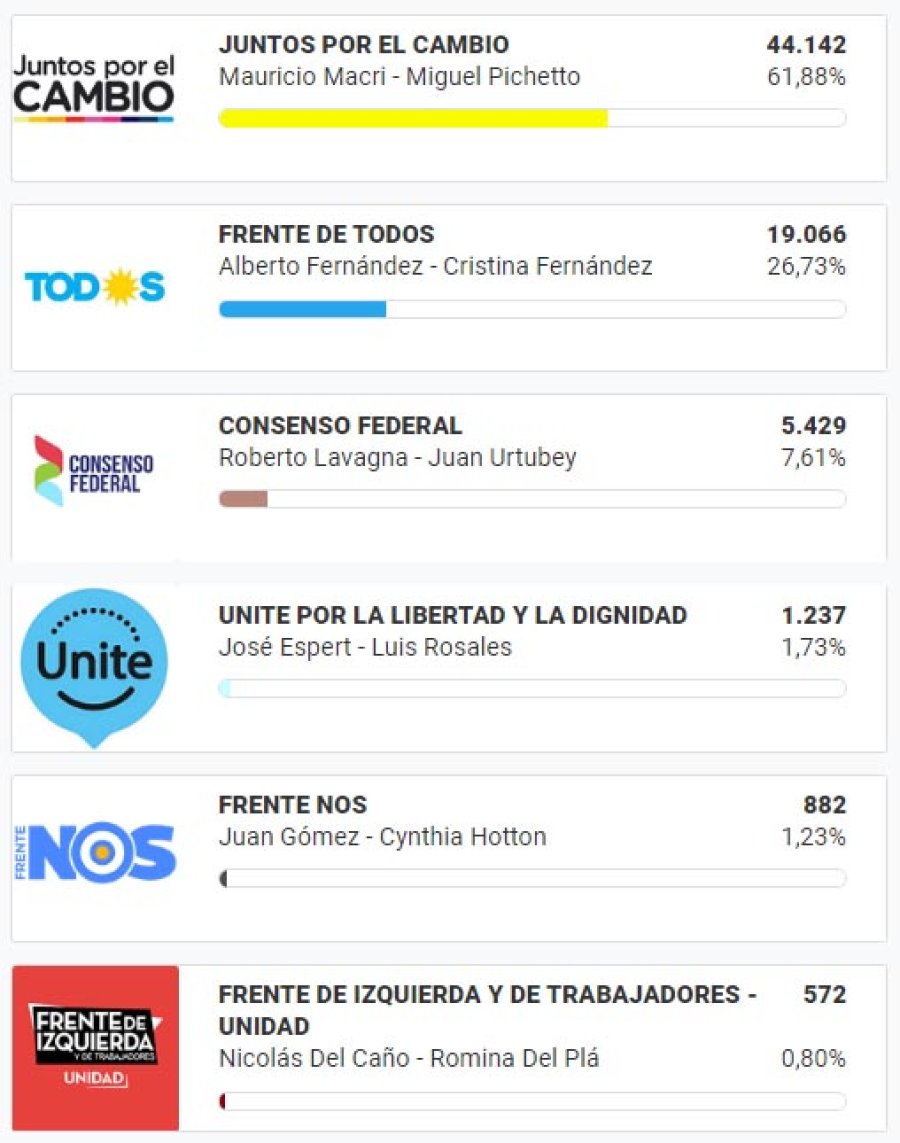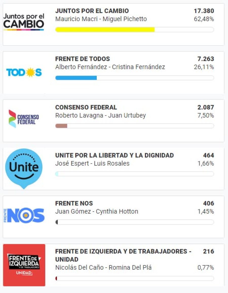 Como decíamos Macri obtuvo en la ciudad 17.380 votos, el 62,48% de los votos. Fernandez cosechó 7.263 el 26,11%, el tercero fue Roberto Lavagna con 2.087 votos el 7.5 % del total. No llegaron a 500 votos Gomez Centurión y Espert mientras que la Izquierda apenas obtuvo 216 voluntades.
