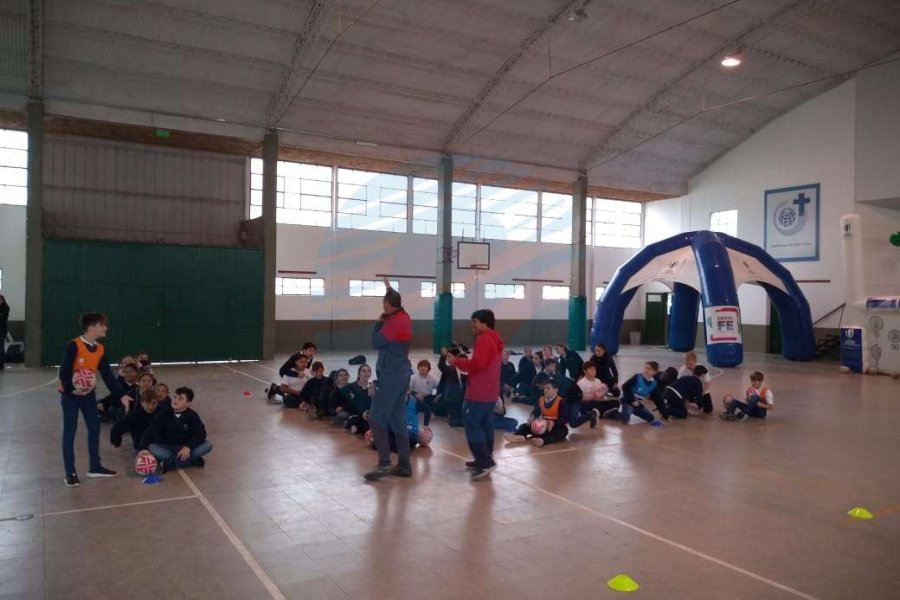 Chicos y chicas de la institución educativa disfrutaron de inflables para aprender rugby, juegos lúdicos y otras actividades inherentes al deporte.