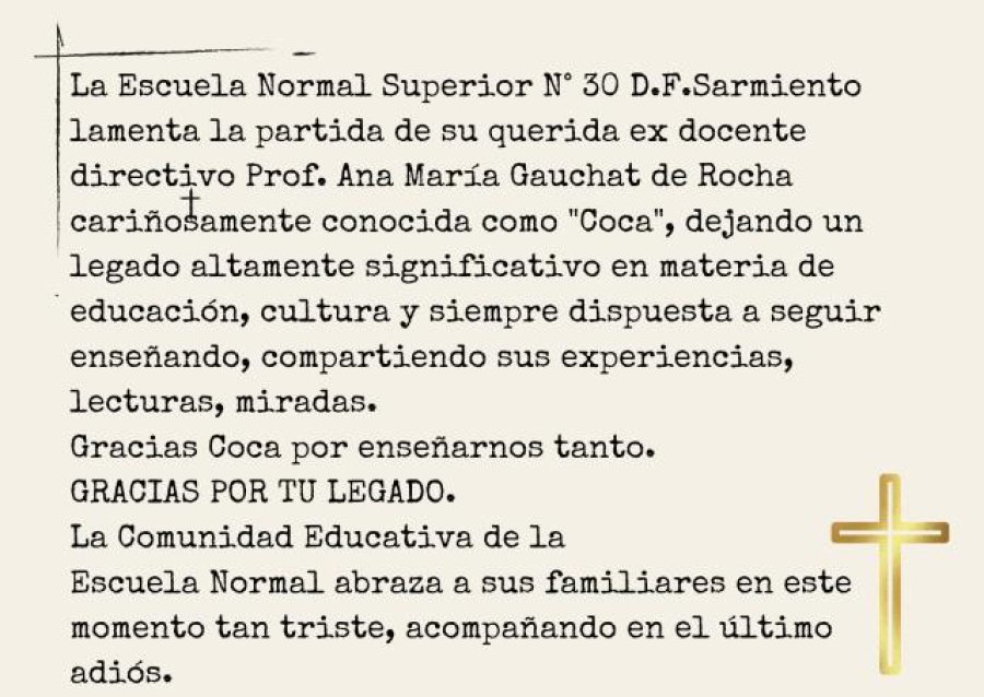 Al momento de conocerse la noticia de su fallecimiento la Escuela Normal 30 realizó un sentido mensaje donde fue contundente: "Gracias Coca por enseñarnos tanto".