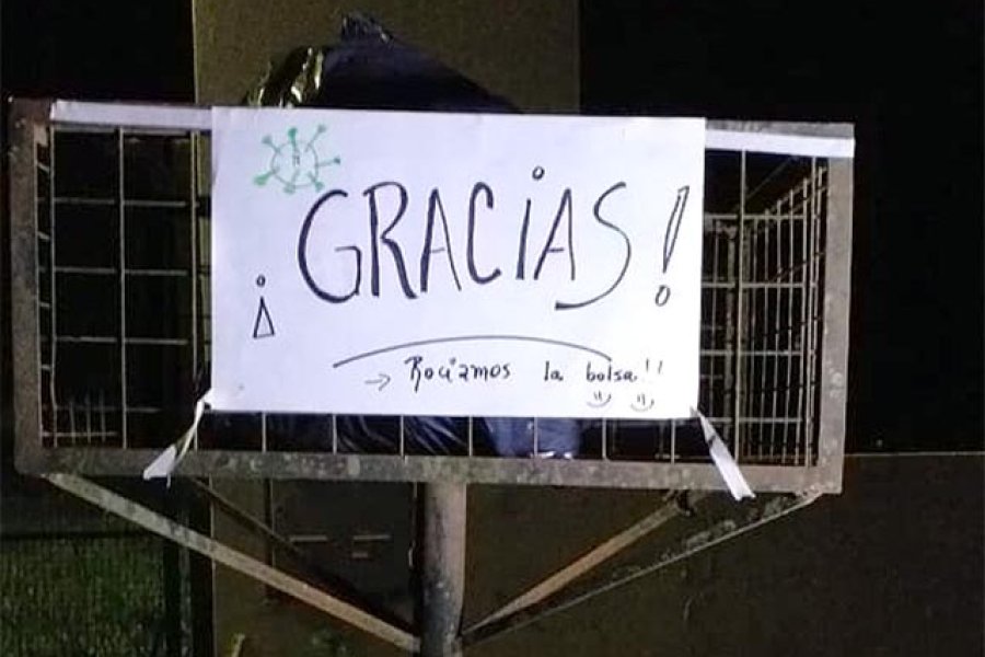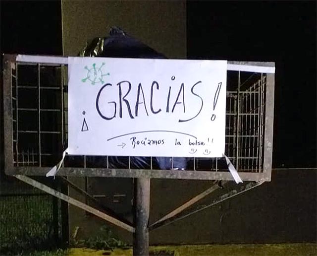 Aquí en Esperanza, en Barrio Unidos, no fueron aplausos porque el horario de trabajo coincide con el descanso de toda la comunidad. Fue así que esta familia encontró una manera original de agradecer y advertir que habían colocado unas gotas de agua con lavandina en la bolsa.