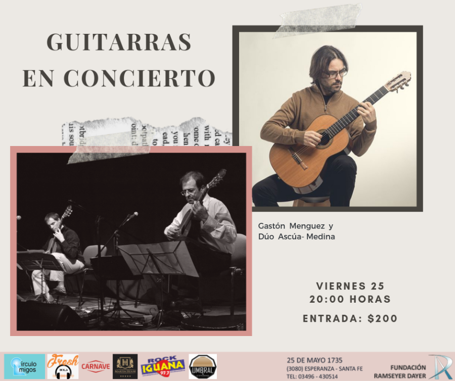 La Fundación Ramseyer Dayer invita a la comunidad a disfrutar del evento musical “Guitarras en concierto” a cargo del dúo de Ascúa- Medina de la ciudad de Santa Fe y Gastón Menguez de nuestra ciudad como músico invitado.