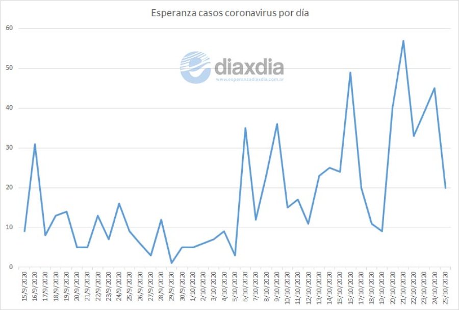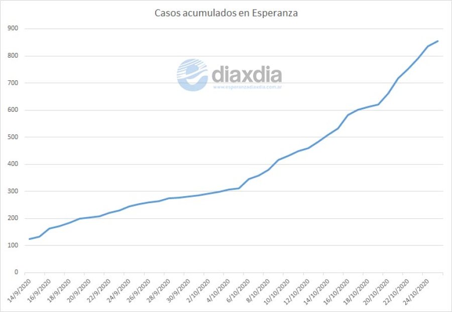 En base a la estadística provincial y sus acumulados Esperanza estaría duplicando casos en 15 días pero si nos aferramos a la diferencia informada en el parte local el lapso de duplicación es mucho menor.