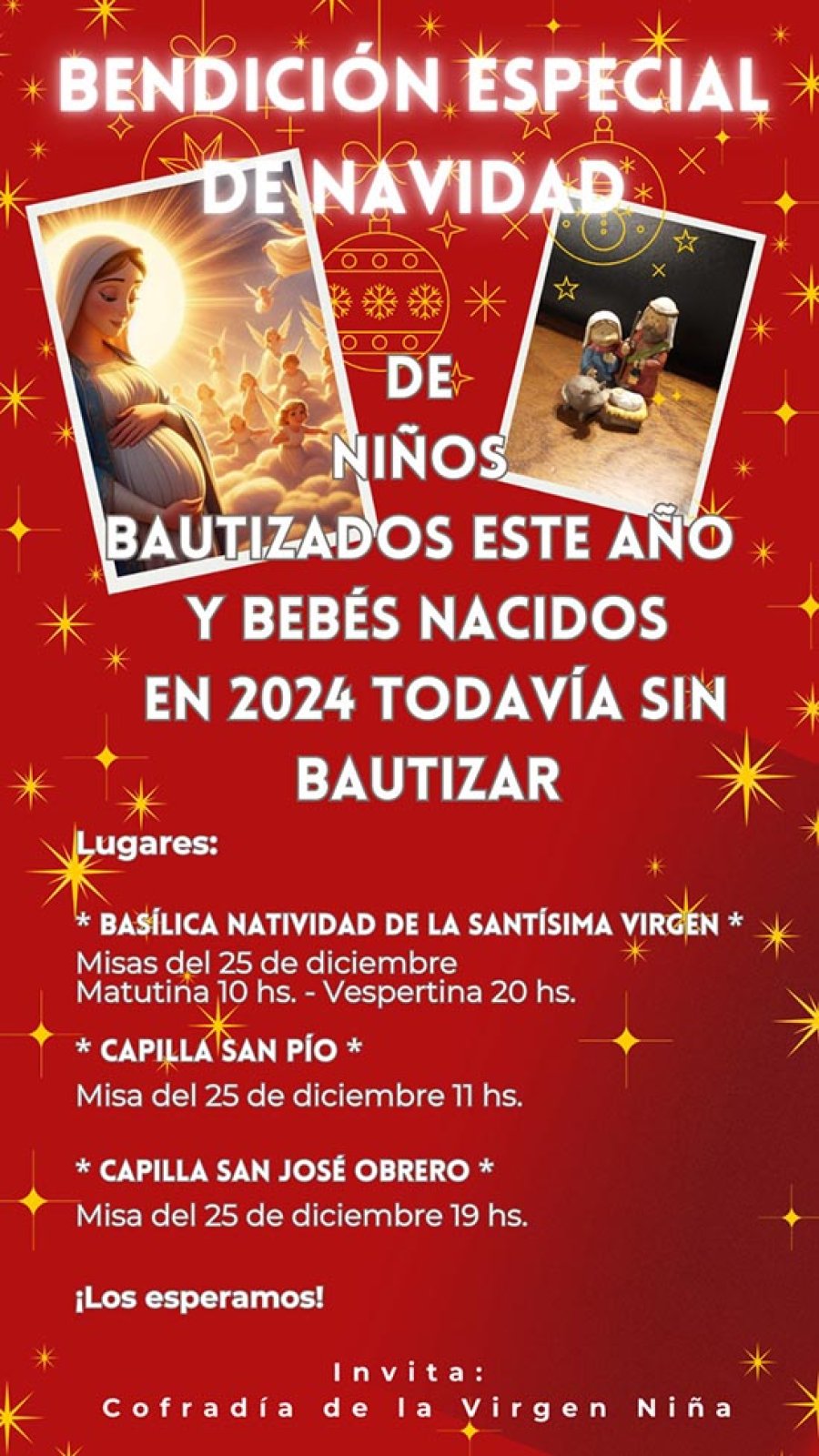 La Cofradía de la Virgen Niña invita a las familias de los niños bautizados durante este año y de los nacidos en 2024 sin bautizar, a acercarlos a la bendición especial que se les impartirá en las misas de Navidad, este 25 de diciembre.