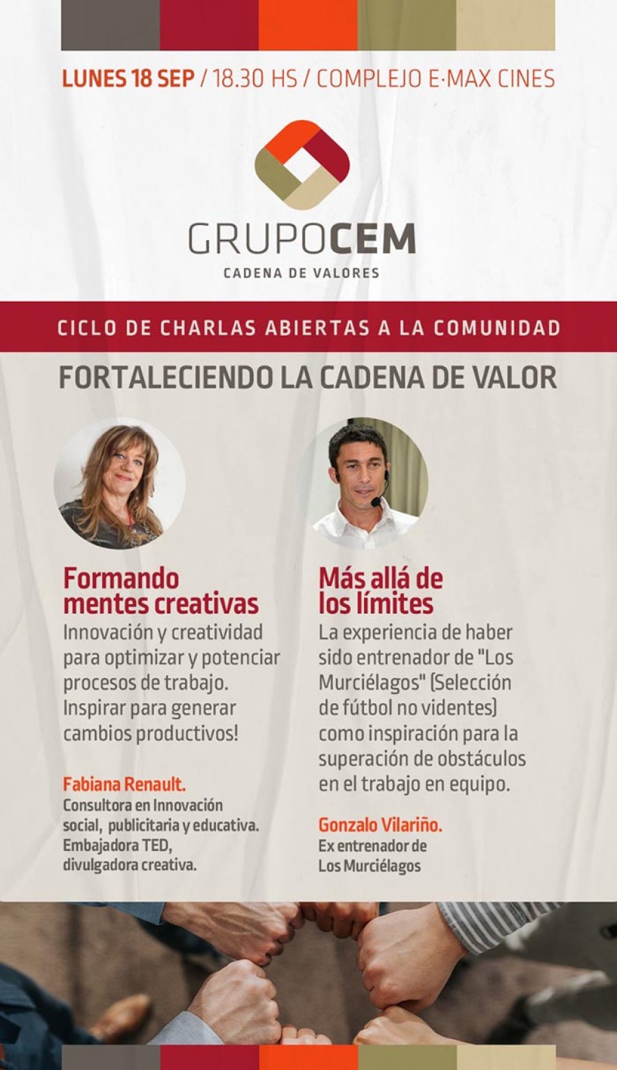 Adelantó que “la primera oradora de la tarde será Fabiana Renault, quien está altamente capacitada para llevar adelante procesos de innovación y de creatividad y tiene muchísimos ejemplos de trabajos que ha desarrollado en el país y el exterior, y será una charla muy interesante. La segunda charla será con Gonzalo Vilariño, ex DT de la selección argentina de fútbol de no videntes, los murciélagos. Él va a contar toda la experiencia que pasó como director técnico al formar ese equipo, que no estaba formado cuando él ingresó”.