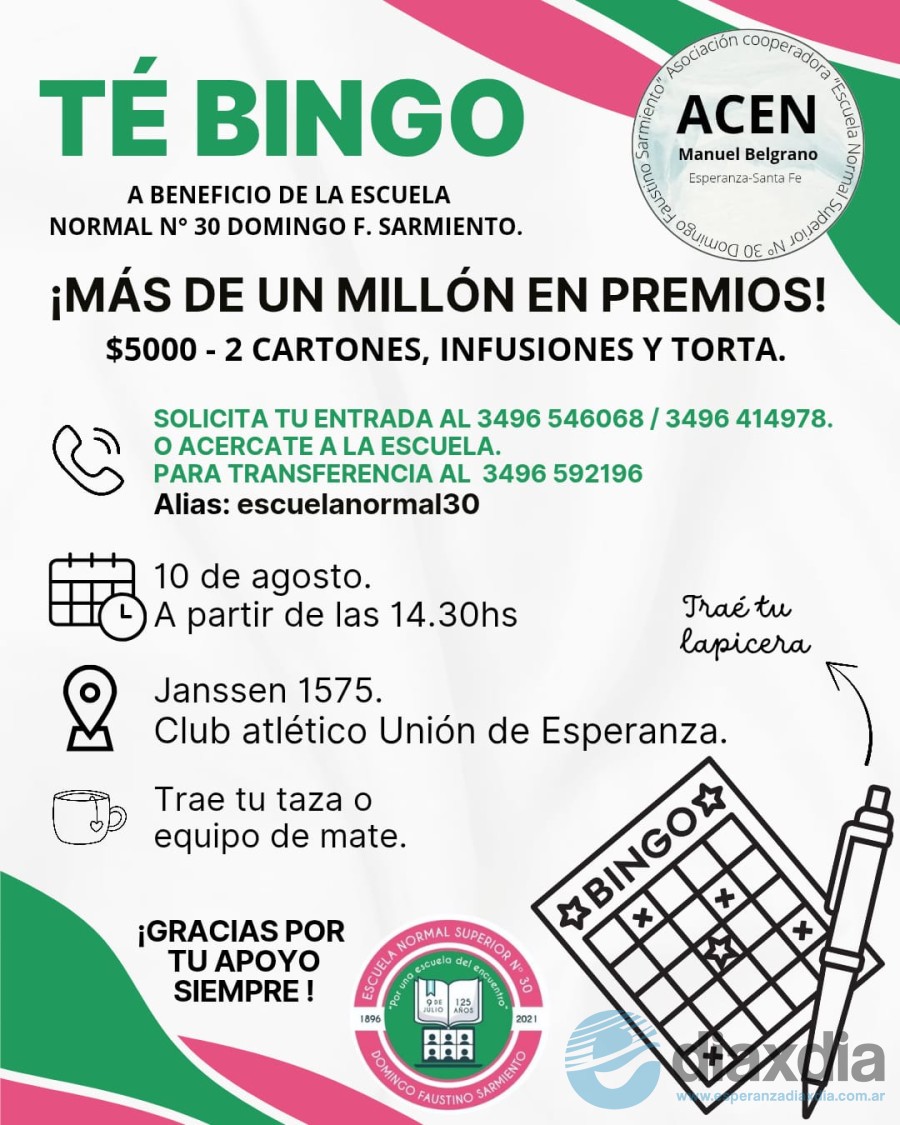 La Cooperadora de la Escuela Normal Superior Nº 30 “Domingo Faustino Sarmiento” quien acompaña el funcionamiento y mantenimiento de los cuatro niveles de la institución (Nivel inicial, Primario, Secundario y Terciario) está invitando a participar de un té bingo benéfico.