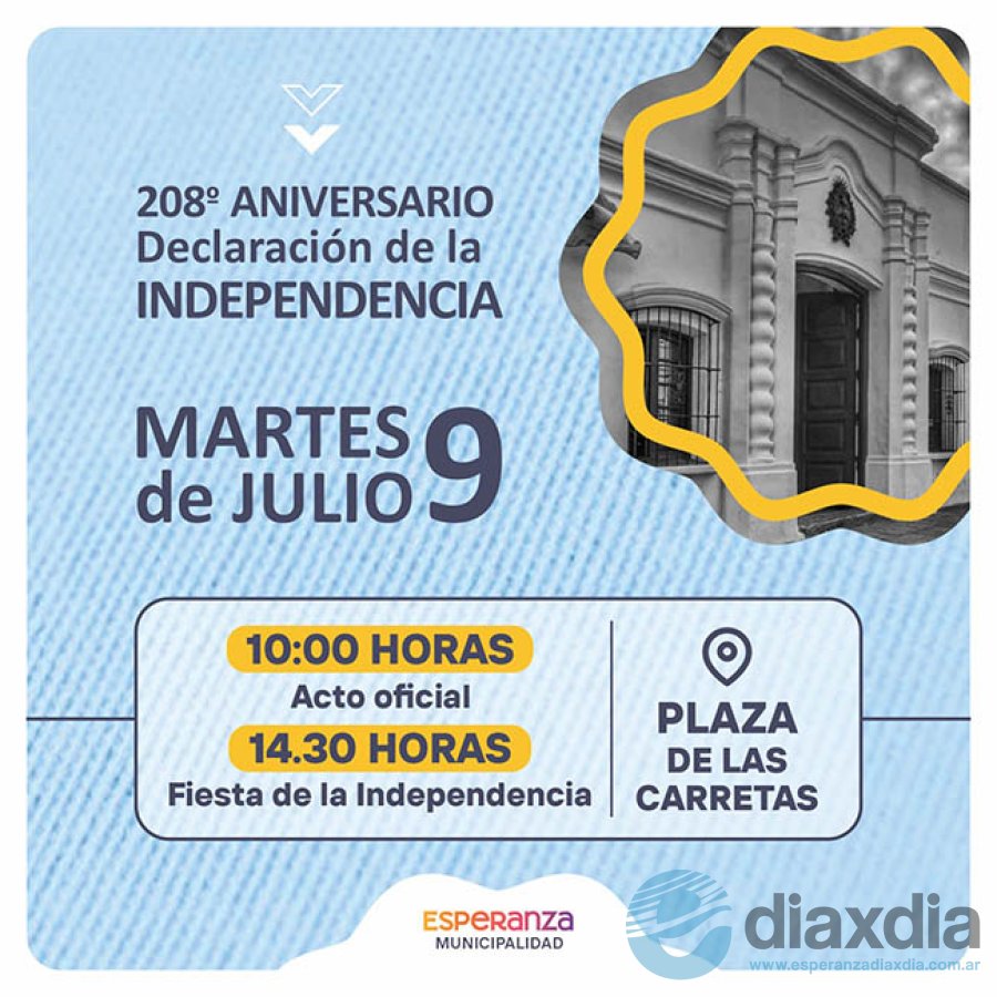 La Municipalidad de Esperanza invita a celebrar el 208° aniversario de la Declaración de Independencia con distintas actividades a realizarse este martes 9 de julio.