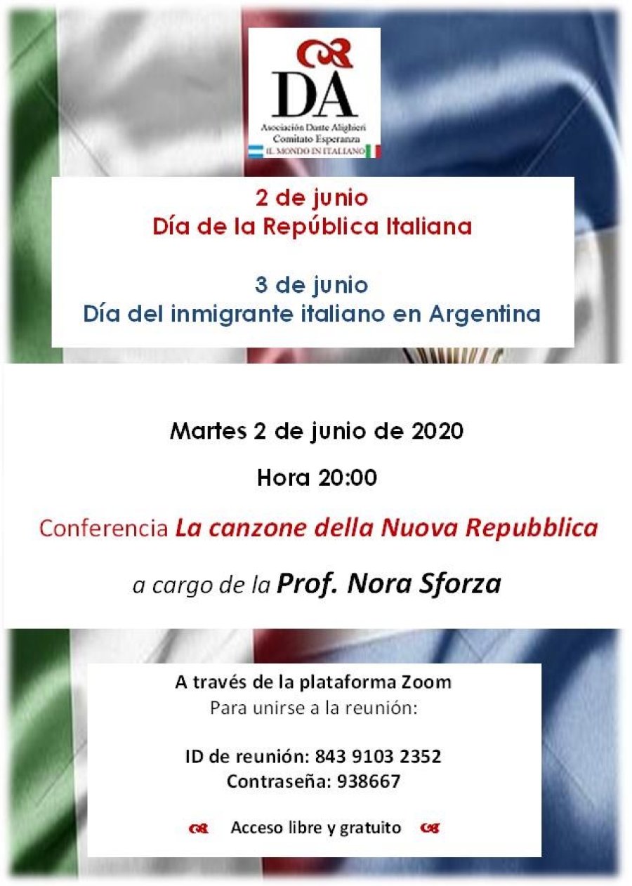 Dado el actual contexto de aislamiento social, preventivo y obligatorio, la celebración de estas fechas tan caras al sentimiento de la comunidad ítalo-argentina, se realizará de manera virtual, a través de la aplicación Zoom. El Martes 2 de junio a las 20:00 hs. se invita a participar de la Conferencia “La canzone della Nuova Repubblica”, a cargo de la Prof. Nora Sforza, de la Asoc. Dante Alighieri de Buenos Aires.