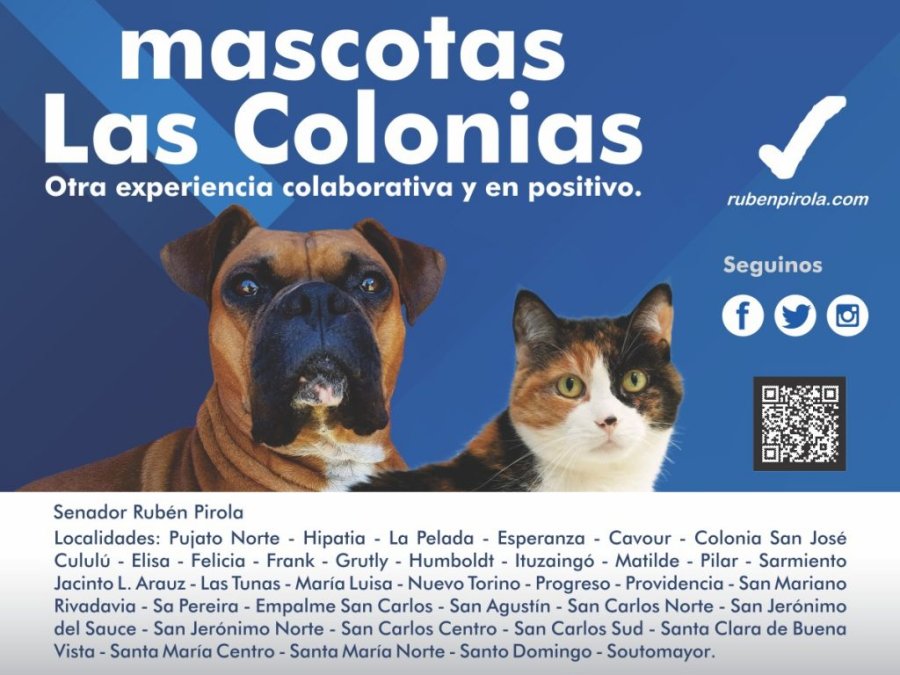 Mascotas Las Colonias, la iniciativa del Senador Rubén Pirola que en un trabajo colaborativo, con los gobiernos locales y la Ong La Red, se transformó en una herramienta más que importante para lograr la salud y bienestar de perros y gatos, en la búsqueda de una convivencia armónica y responsable con nuestras mascotas en cada una de nuestras comunidades, confirmó las fechas y localidades en las que intervendrá este mes de febrero.