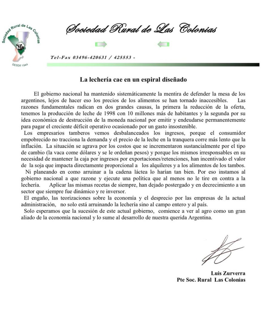 El documento difundido por la Sociedad Rural Las Colonias lleva la firma de su presidente, Luis Zurverra, y se titula "La lechería cae en un espiral diseñado" y expresa textualmente: