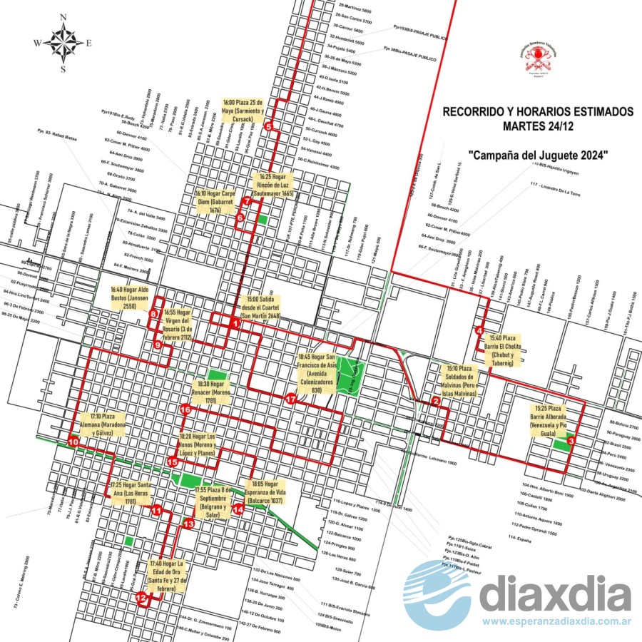 A las 16 estiman llegar a la plaza del barrio La Orilla, la plaza 25 de Mayo en Sarmiento y Cursack. Luego se detendrán en el Hogar Carpe Diem, en el Hogar Rincón de Luz, en el Hogar Aldo Bustos y en el Hogar Virgen del Rosario de 3 de febrero 2112.