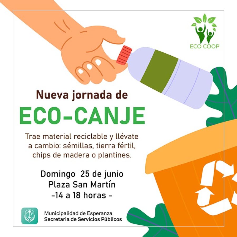La Secretaría de Servicios Públicos, en conjunto con la Cooperativa de trabajo ECOCOOP, organiza una nueva jornada de “ECO-CANJE”, la cual consiste en que los vecinos puedan canjear materiales reciclables a cambio de plantines de flores, chips de madera para mulch, bolsas con compost y semillas de árboles nativos.