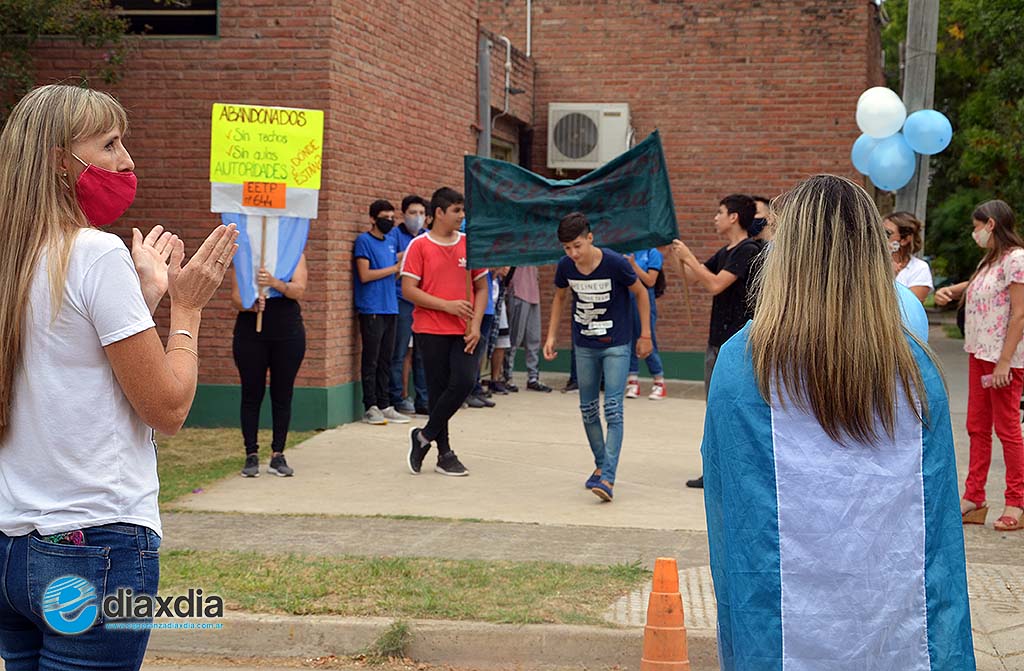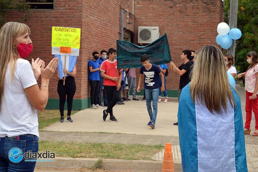 Hoy la comunidad educativa reclamó a todos los dirigentes políticos una respuesta para lograr la concreción de edificio escolar. Cantaron el himno nacional, diferentes docentes hicieron uso de la palabra y luego concretaron un abrazo simbólico al edificio. La "sentada" se repetirá este martes por la mañana.