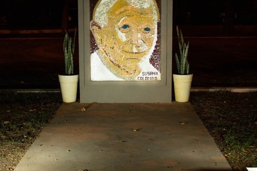 La profesora Susana Colombo utilizando la técnica de mosaiquismo realizó una obra de arte en honor a Juan Pablo II en la vecina localidad de Nélson.