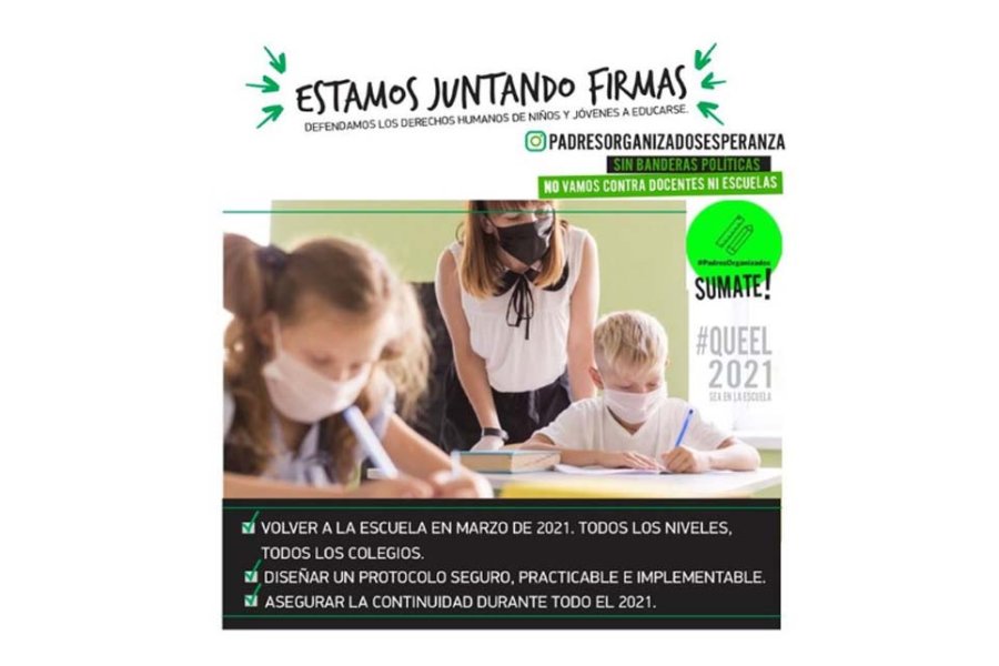 Bajo la consigna "Que el 2021 sea en las aulas" un importante grupo de padres organizados de nuestra ciudad comenzó a juntar firmas para pedir el regreso a la normalidad educativa. Impactante reacción social ante el año educativo que finaliza estos días.