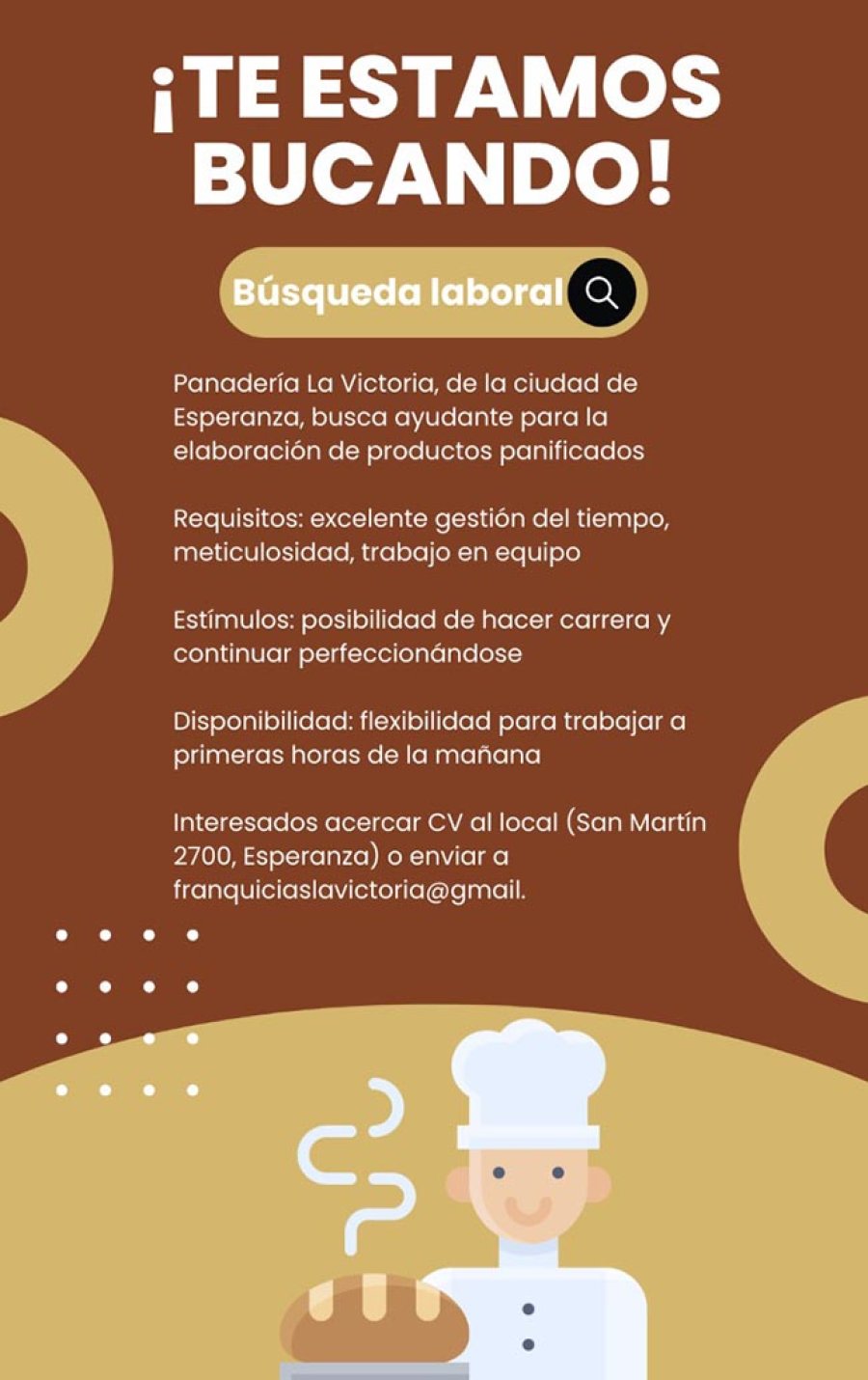 Panadería La Victoria, de la ciudad de Esperanza, busca ayudante para la elaboración de productos panificados.