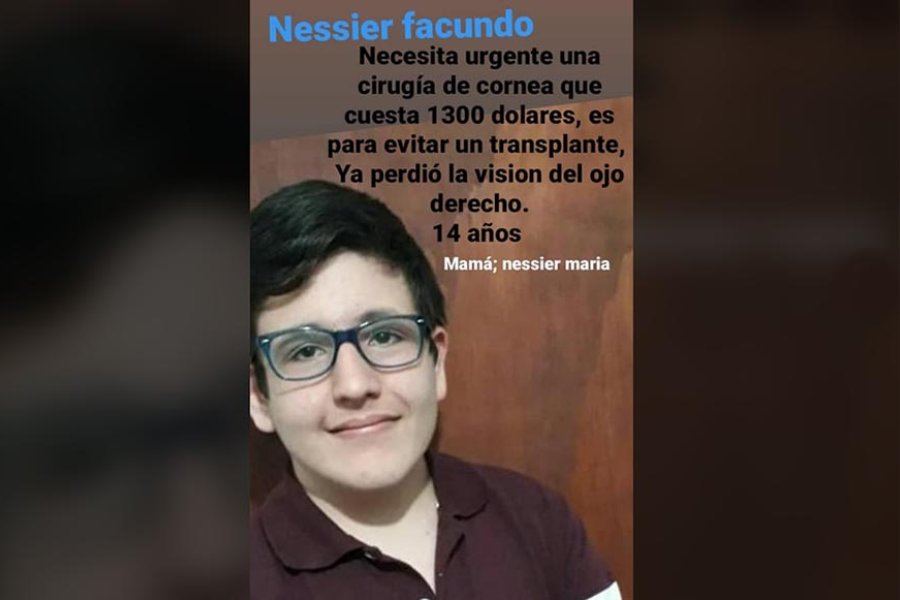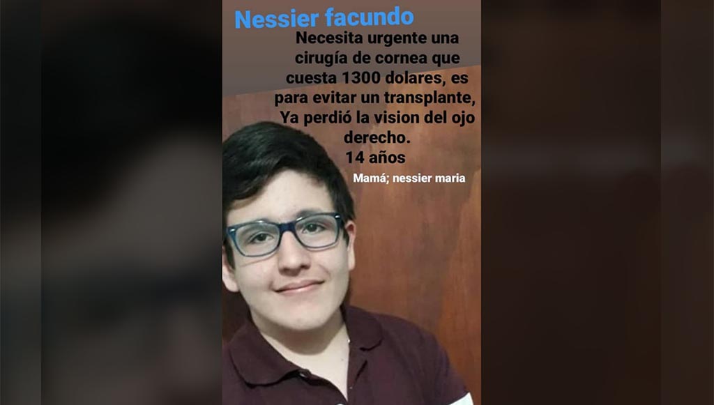Facundo padece queratocono en el ojo derecho (N.R: afección que ocasiona que sobresalga el tejido transparente en la parte frontal del ojo-córnea) y necesita operarse de sus dos ojos para recuperar la vista. Se trata de una cirugía de entre 2.000 y 2.100 dólares y todavía no se logró recaudar ni la mitad.