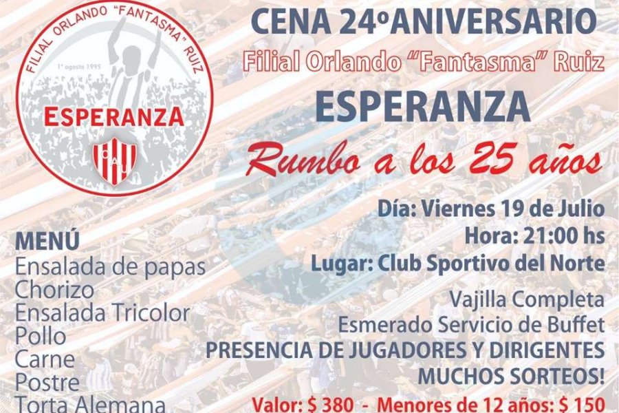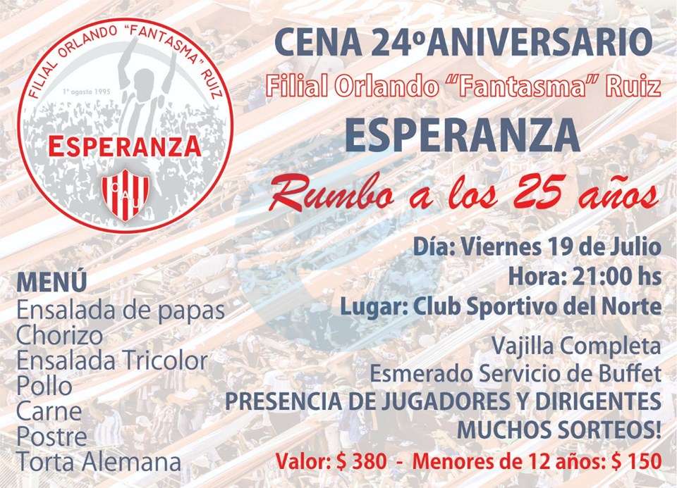La Filial Esperanza “Fantasma Ruiz” del Club Unión de Santa Fe organiza su Cena 24° Aniversario, que promete ser una verdadera fiesta rumbo a los 25 años de la entidad en la ciudad.