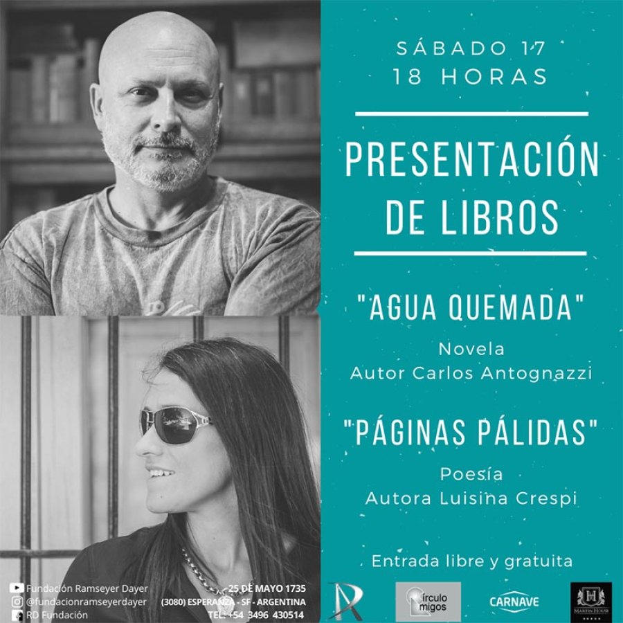 La Fundación Ramseyer Dayer invita a la presentación de los libros “Páginas pálidas” (poesía) de la autora Luisina Crespi y “Agua quemada” (novela) del autor Carlos Antognazzi, ambos residentes en la ciudad de Santo Tomé.